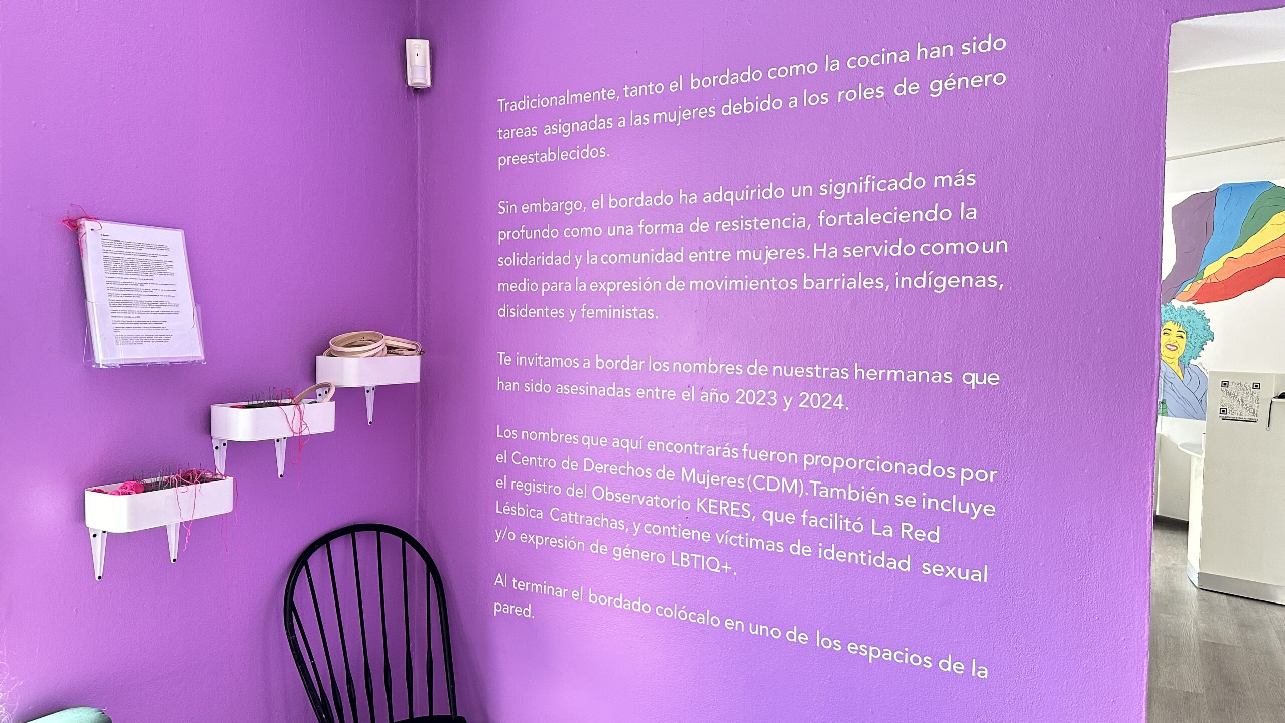 Este manifiesto fue compuesto por una serie de acciones en el territorio que se les ha robado a las mujeres: las calles y la noche. Este territorio que debería ser de vida, alegría y gozo, se ha vuelto hostil y violento. Esta exposición 'La Justicia que nos damos' es una encarnación del manifiesto que se presentó y su proceso de creación. Visibilizando los resultados e invitando a recrear y participar en el mismo proceso creativo. Contemplando la actual realidad de nuestro entorno, pasando por un viaje de reflexión e introspección, donde se vindica, acuerpa y sana. Dándonos a nosotras mismas la equidad y justicia que se nos niega por la sociedad y el estado.