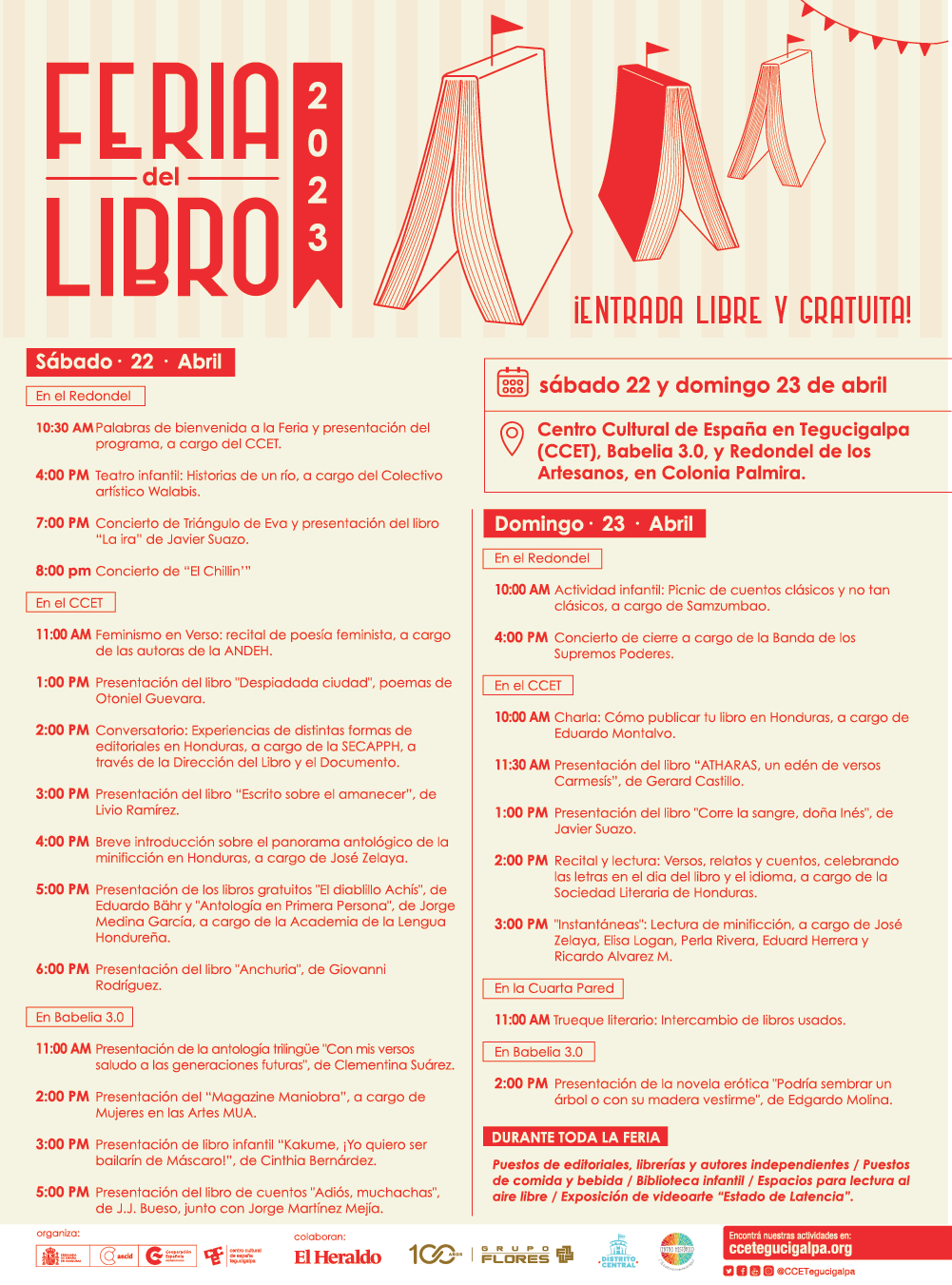 Conmemorando el Día Internacional del Libro y del Idioma Español, este sábado 22 y domingo 23 de abril, el Centro Cultural de España en Tegucigalpa organiza la Feria del Libro en el Redondel.