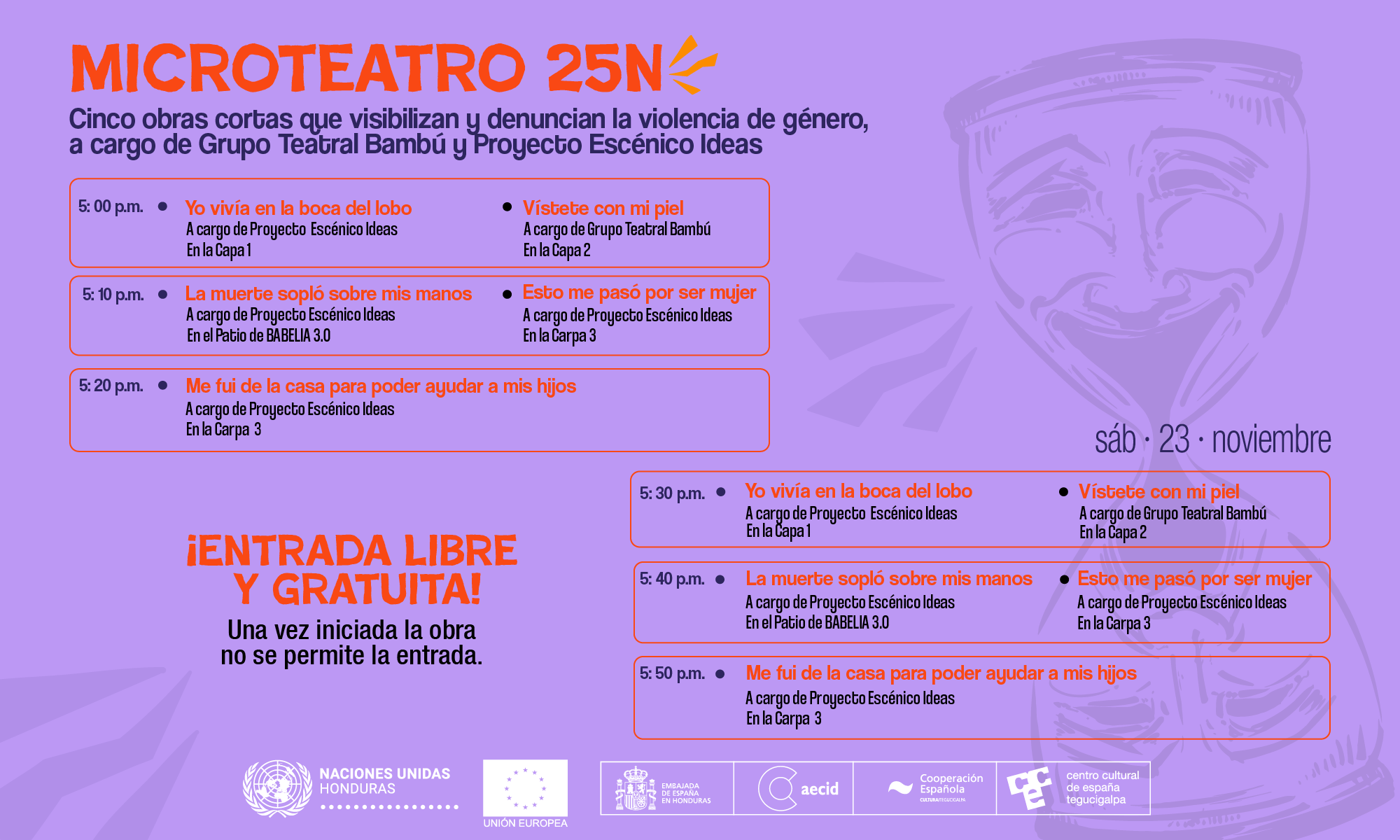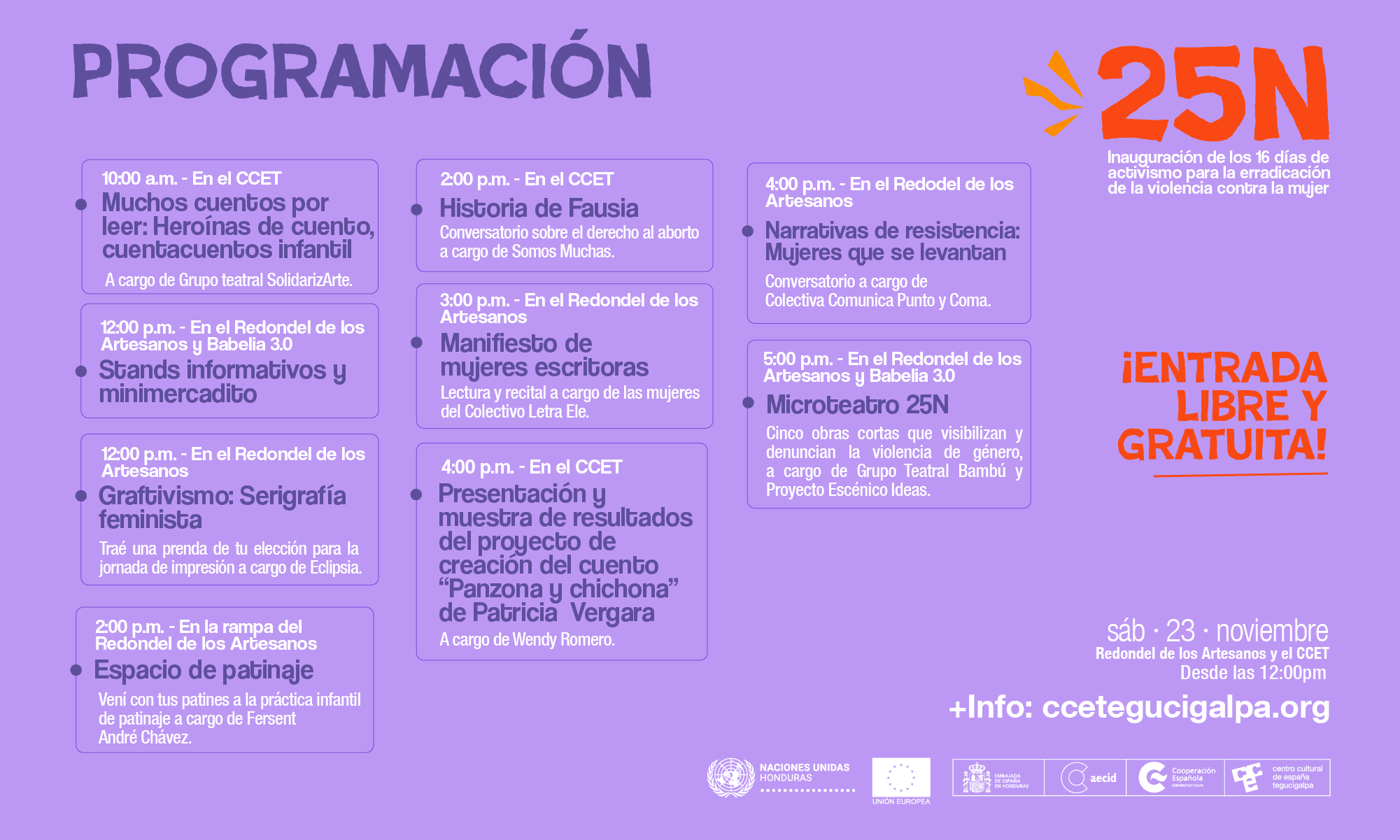 El Centro Cultural de España en Tegucigalpa (CCET) te invita a la inauguración de los 16 días de activismo para la erradicación de la violencia contra la mujer, un evento que tendrá lugar el sábado 23 de septiembre, a partir de las 12:00 pm, en el renovado Redondel de los Artesanos y en las instalaciones del CCET. Esta jornada especial busca reunir a mujeres y colectivas feministas para iniciar una temporada de reflexión, colaboración y celebración en torno a los derechos de las mujeres.