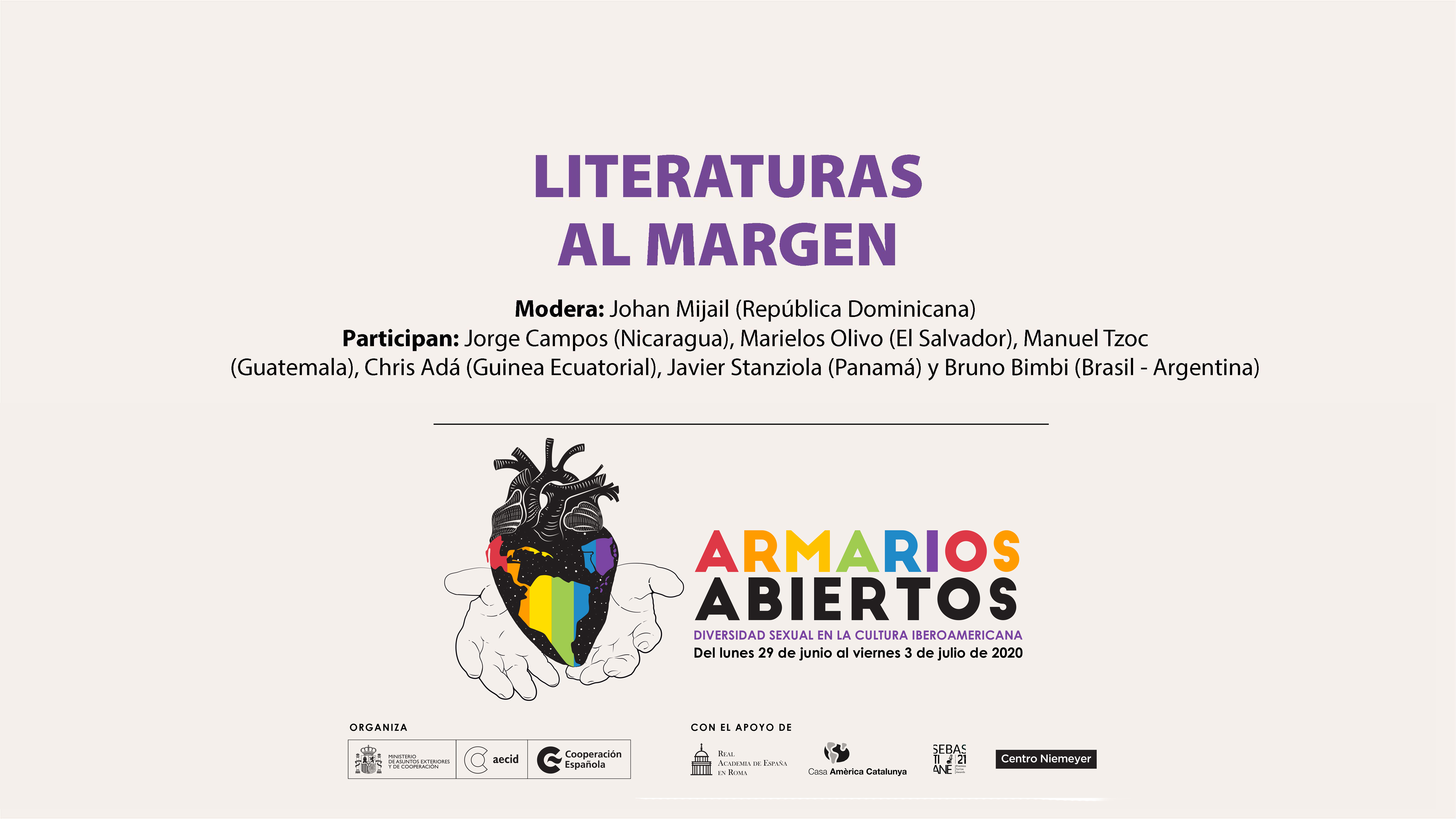 12:00 p.m. || Literaturas al margen || Modera: Johan Mijail (República Dominicana) || Participan: Jorge Campos (Nicaragua) – Marielos Olivo (El Salvador) – Manuel Tzoc (Guatemala) – Chris Adá (Guinea Ecuatorial) – Javier Stanziola (Panamá) – Bruno Bimbi (Brasil - Argentina)
